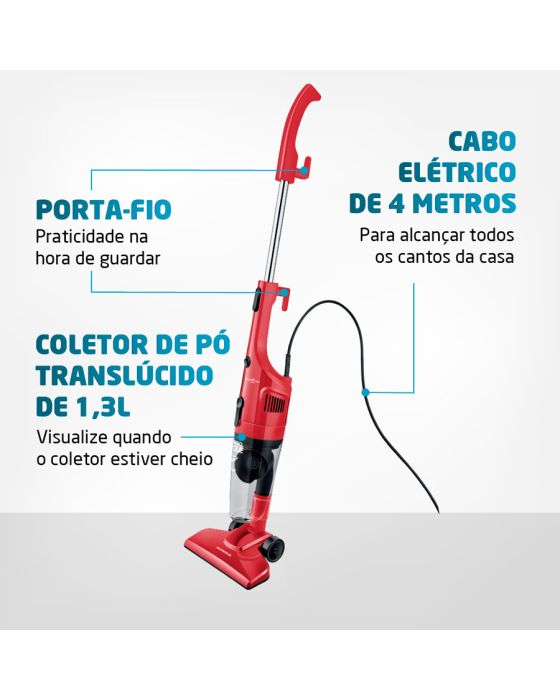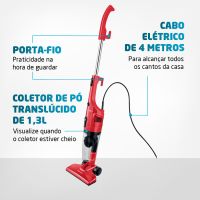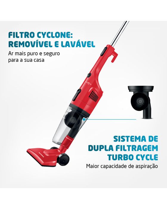 Características:Garanta mais poder de sucção com o Aspirador de Pó Turbo Cycle AP-36. A função 2 em 1 permite sua utilização no modo portátil ou vertical. Seus 1100W de potência, com motor superpotente, limpa mais rápido e com eficiência. O sistema de dupla filtragem Turbo Cycle é removível e lavável, além de ser ecológico. Além disso, tem coletor de pó translúcido com capacidade para 1,3 litros e cabo elétrico de 4 metros.Detalhes:- Marca: Mondial;- Modelo: Turbo Cycle;- Referência: AP-36;- Linha: Aspiradores de pó;- Cor: Vermelho/Preto;- Voltagem: 220V;- Capacidade do reservatório de pó: 1,3L;- Contém: 1 unidade do produto;- 2 em 1: Possui haste removível e pode ser utilizado como aspirador vertical ou portátil. Na versão portátil, ele é perfeito para limpeza de estofados, carros e teclados;- Filtro Lavável: O filtro Cyclone é removível e lavável, ou seja, é mais prático e fácil de limpar. Além disso, por não precisar de saco coletor, o aspirador é mais econômico e sustentável;- Sistema de Supla Filtragem: O Turbo Cycle (sistema de dupla filtragem) mantém os filtros limpos e desobstruídos, o que aumenta a capacidade de aspiração;- Potência de 1100W: Proporciona alta eficiência na sucção da sujeira, possibilitando uma limpeza mais rápida;- Coletor de pó translúcido: é fácil de limpar. Você consegue visualizar quando o coletor de pó está cheio;- Cabo elétrico com 4 metros: Alcança facilmente todos os cantos da sua casa;- Porta-Fio + Porta Acessórios: Mais praticidade na hora de guardar;Acessórios:- Acompanha 1 bocal multiuso, 1 bocal para cantos e frestas, e 1 bocal para estofados.Onde usar:- Para diferentes tipos de superfícies: piso frio, carpete, tapetes, carro, teclado e estofados.Energia:- Voltagem/Tensão: 220V;- Potência: 1100W.Medidas:- Dimensões do produto: 109 x 23 x 13,5cm ((AxLxP);- Peso: 1,5kg;- Comprimento do cabo: 4 metros.Garantia do fornecedor: 1 ano contra defeitos de fabricação.Conteúdo da embalagem: 01 Aspirador de Pó, 01 Bocal multiuso, 01 Bocal para cantos e frestas, 01 Bocal para estofados e 1 Manual de Instruções.* As especificações podem ser alteradas sem aviso prévio ** Imagem meramente ilustrativa