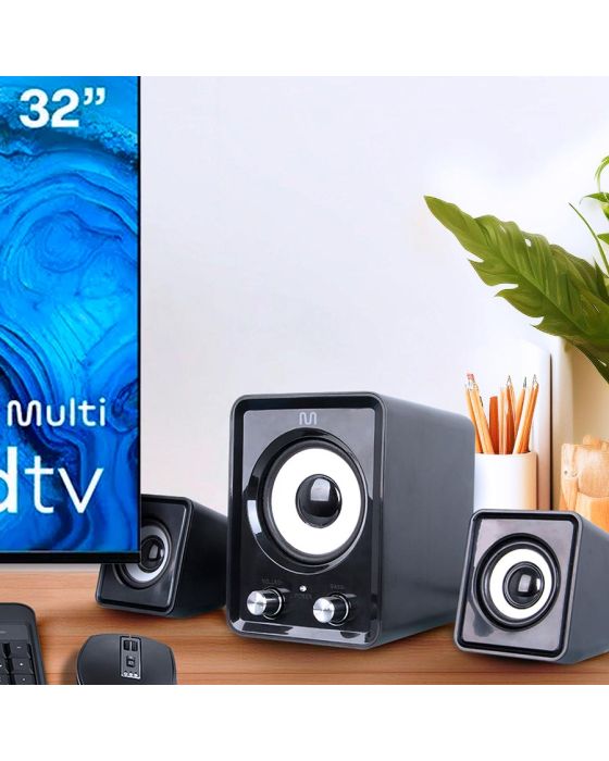 Características:Esta caixa de som é ideal para proporcionar alta qualidade, praticidade e simplicidade ao seu dia-a-dia.Com tecnologia de conexão Plug e Play, conecte a entrada P2 de áudio e USB de energia, e comece a usar. A caixa de som possui 14W RMS de potência, design estéreo, controle de volume, além função Super Bass para deixar os graves mais evidentes.Detalhes:- Marca: Multi;- Modelo: CX1000;- Referência: SP172;- Linha: Caixas de som;- Tipo: Mesa;- Potência: 14W;- Cor: Preto com detalhes em branco;- Conexão: P2 (3,5mm);- Sistema de som 2.1 com subwoofer;- Controle integrado para ajustes de volume.Fabricado na China. | Validade: Indeterminada.Especificações Gerais:- Canais: 2.1;- Alimentação: USB;- Comprimento do cabo: 120cm;- Entrada para Headset: Não;- Botão Liga/Desliga: Sim;- Luz de Status: Sim;- Controles de graves: Sim;- Controles de volume: Sim.Som: - Potência: 14W;- Sensibilidade: 65dB;- Frequência: 100Hz - 18kHz;- Impedância: 4;- SPL Máximo: 96dB.Compatibilidade:- Windows, Linux, MacOS, Windows®.Composição:- Fabricado em plástico ABS e componentes eletrônicos.Medidas:- Dimensões do produto: 13 x 13 x 10cm (CxLxA);- Dimensões da embalagem: 20,9 x 10,4 x 13,7cm (CxLxA);- Peso: 595g.Conteúdo da embalagem: 1 caixa de satélite esquerda, 1 caixa de satélite direita, 1 subwoofer e 1 Subwoofer.Garantia do fornecedor: 3 anos contra defeitos de fabricação.* As especificações podem ser alteradas sem aviso prévio ** Imagem meramente ilustrativa.