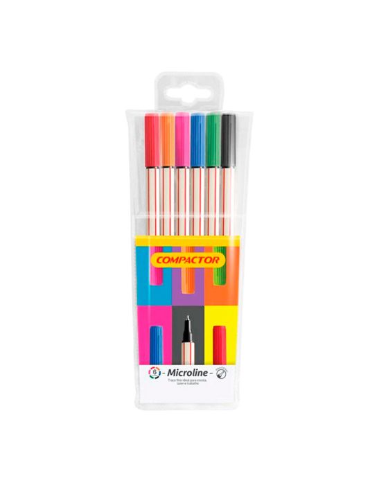 Características:A Microline é a linha de Fineliners da Compactor que é o maior sucesso. Combinam a versatilidade de cores das canetas hidrográficas com uma ponta ultra fina, capaz de produzir traços precisos e com alto grau de detalhamento.São ótimas para quem gosta de caprichar na caligrafia, especialmente quem tem letra pequena. Também fazem muito sucesso entre a turma dos sketchnotes, doodles, mandalas e livros de colorir.Detalhes:- Marca: Compactor;- Modelo: Microline;- Linha: Canetas Hidrográfica;- Cores: Vermelho, Laranja, Rosa, Azul escuro, Verde escuro e Preto; - Ponta: 0,4mm;- Contém: 1 embalagem com 6 unidades;- Formato do corpo: Redondo;- Cores pasteis;- Hidrográfica de ponta resistente;- Produto Atóxico e tampa asfixiante;- Tinta à base de água com ótimo rendimento;- Pode ficar destampada: 1 semana sem tampa e não seca;- Possui cheirinho.Industria Brasileira.Ideal para: - Traço fino para escola lazer ou trabalho.Composição:- Fabricado em Ponta de Poliacetal com suporte de latão, pavio de poliéster, Resinas plásticas e tinta atóxica a base de águaMedidas:- Dimensões da embalagem: 19 x 11 x 1cm (CxLxA);- Peso: 120g.ATENÇÃO! NÃO RECOMENDÁVEL PARA CRIANÇAS DE ATÉ 4 (QUATRO) ANOS, POR CONTER PARTE(S) PEQUENA(S) QUE PODE(M) SER ENGOLIDA(S) E PONTA(S) AGUDA(S) FUNCIONAL(IS), CRIANÇAS ENTRE 5 (CINCO) E 8 (OITO) ANOS SOMENTE SOB SUPERVISÃO DE UM ADULTO. * As especificações podem ser alteradas sem aviso prévio ** Imagem meramente ilustrativa.