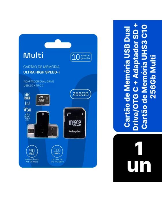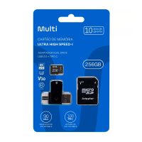 Características:Salve mais fotografias de alta qualidade e vídeos 4K com o cartão Ultra Hight Speed da Multi. Com capacidade de armazenamento de 256GB, você pode tirar mais fotos e classificação de vídeo Classe 3 (U3) e Classe 10 para gravação de vídeo de alta qualidade.Detalhes:- Marca: Multi;- Modelo: Kit 3 em 1;- Referência: MC154;- Linha: Cartão de memória;- Cor: Preto;- Capacidade: 256gb;- Contém: 1 unidade do produto; - Leitura de até 100MB/s;- Gravação até 90MB/s de leitura.- Ideal para smartphones, tablet Android e drones DJI;- Ideal para gravação de vídeos em 4K;- Utilize como cartão de memória, Pen Drive USB + OTG ou Cartão SD.Leitor de Cartão:- Compatibilidade: USB 2.0 e Adaptador Tipo C;- Taxa de transferência: Até 480MB/s.Cartão de Memória:- Durabilidade: À Prova de água, choque, vibração e temperaturas extremas;- Taxa de transmissão de dados: Até 90MB/s (Gravação) e até 100MB/s (Leitura);- Voltagem de operação: 2,7V ~3,6V.Ideal para:- Ideal para seu smartphone Android™, câmeras de ação ou drones.Composição: - Fabricado em material plástico, metálicos e componentes eletrônicos.Medidas:- Dimensões Leitor de Cartão: 3,1 x 2,2 x 0,9cm (CxLxA);- Dimensões Cartão de Memória: 1,5 x 1,1 x 0,1cm (CxLxA);- Dimensões do produto: 14,5 x 9 x 0,05cm (CxLxA);- Peso Leitor de Cartão: 3g;- Peso Cartão de Memória: 2,5g;- Peso: 14g.Conteúdo da embalagem: 1 Cartão de Memória 256gb, 1 Adaptador para cartão de memória e 1 Adaptador USB/OTG.Garantia do fornecedor: 10 anos contra defeitos de fabricação a partir da data de aquisição do produto.* As especificações podem ser alteradas sem aviso prévio ** Imagem meramente ilustrativa.