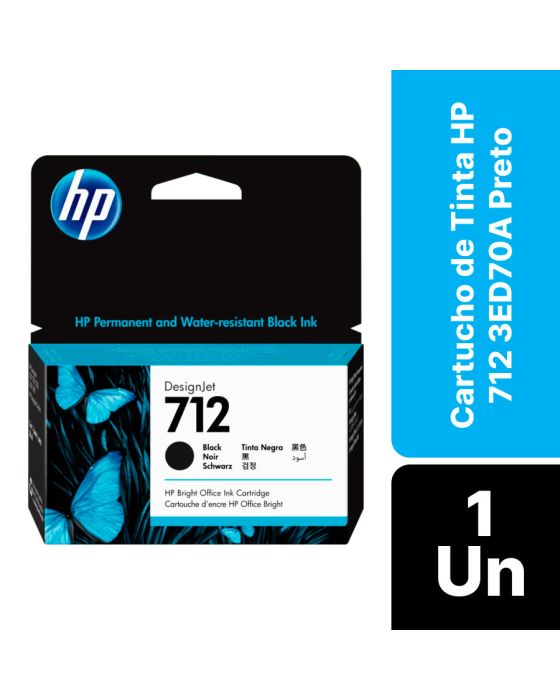 Características:Imprima documentos com cores nítidas e intensas. As tintas HP originais oferecem uma resistência extraordinária à descoloração e confiabilidade e desempenho superiores.A qualidade da HP que você conhece e confia agora mais acessível do que nunca. Imprima documentos e fotos resistentes à água e manchas e economize em impressão freqüente com os cartuchos originais HP.Detalhes:- Marca: HP;- Modelo: 712;- Referência: 3ED70A;- Linha: Cartuchos;- Cor: Preto;- Volume cartucho: 38ml;- Contém: 1 unidade do produto;- Tecnologia de impressão: Jato de Tinta;- Produto Original.Fabricado na Malásia.Impressoras Compátiveis:- Modelos Impressora HP DesignJet T210, Impressora HP DesignJet T230, Impressora HP DesignJet T250, Impressora HP DesignJet T630, Impressora HP DesignJet T650.Medidas:- Dimensões embalagem: 12 x 3,6 x 12,4cm (CxLxA).Descarte de Cartuchos e Toners:- Você pode fazer o descarte com ajuda do ReCiclo, um projeto da Contabilista através da Contabilista Responsável, basta enviar os seus resíduos para a nossa Central de Distribuição*, se você é de Curitiba ou de Joinville, pode ir até uma de nossas lojas ou preencher o formulário disponível no site para solicitar retirada de materiais.Acesse o Link para verificar as marcas que reciclamos e nossos endereços: https://www.contabilistaresponsavel.com.br/reciclo.* Enviar conteúdo aos cuidados do Setor de Reciclagem.** Atenção: Cartuchos e Toners compatíveis não entram no descarte do ReCiclo, apenas suprimentos originais de nossos parceiros (confira a lista no link acima).Conteúdo da embalagem: 1 Cartucho de Tinta.* As especificações podem ser alteradas sem aviso prévio ** Imagem meramente ilustrativa.