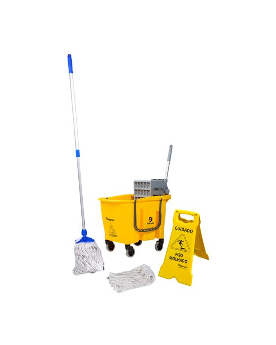 Caracteristicas:Novos kits completos formados à partir do Novo Balde Doblo Flex 30 para a limpeza úmida de pisos em geral.Em um só kit, todos os itens necessários para a implantação imediata da limpeza com mops úmidos com todas as vantagens que os produtos Bralimpia proporcionam.Itens que compõem o kit- 1 Balde Doblô 30 Litros - 2 águas- 1 Cabo Telescópico 1,40m- 1 Garra Euro Plástica- 1 Refil Loop com cinta 320g- 1 Placa Sinalizadora Piso MolhadoEspecificações- Dimensões do balde (AxLxC): 82 x 37 x 64cm- Peso do balde: 8,6kg- Dimensões da placa montada (AxLxC): 65 x 27 x 38cm- Dimensões da placa fechada (AxLxC): 65 x 27 x 4cm* As especificações podem ser alteradas sem aviso prévio ** Imagem meramente ilustrativa
