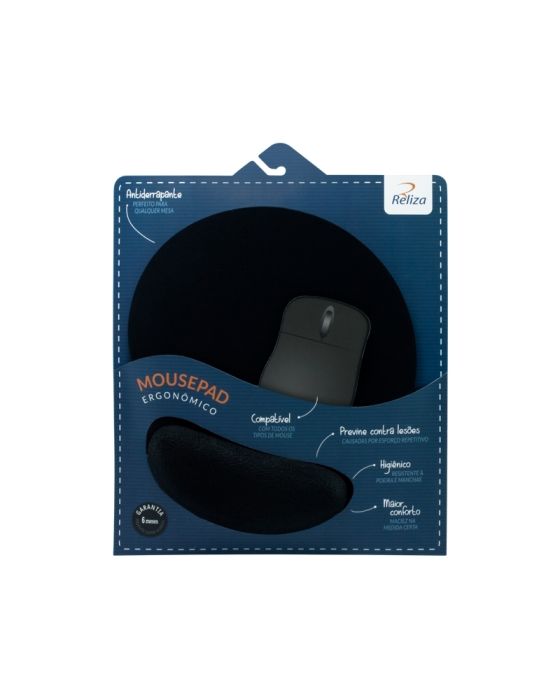 CaracteristicasSeu Punho na Posição Correta - Ficar em frente ao computador e utilizar o mouse diariamente, requerem cuidados essenciais com o posicionamento dos braços. É crucial manter a posição correta e ergonômica dos punhos e da mãos, prevenindo assim, Lesões causadas por Esforço Repetitivo (LER) e Distúrbios Osteomusculares Relacionados ao Trabalho (DORT).Material Macio e Higiênico - A base de apoio para punho do Mousepad Ergonômico Reliza, foi desenvolvida em material especial que proporciona maciez na medida certa e uma solução mais higiênica para o uso diário e prolongado, oferecendo melhor resistência à poeira, manchas e proliferação de bactérias. A base de apoio para punho pode ser facilmente higienizada com álcool gel, sem danificar o material.Área de circulação do mouse desenvolvida em Neoprene - Toda a área de circulação do mouse foi desenvolvida em Neoprene, revestida com uma delicada camada de poliéster, que favorece os movimentos precisos ao utilizar o mouse.Base antiderrapante - A parte inferior (apoiada na mesa) possui textura antiderrapante, evitando que o mousepad deslize e atrapalhe a performance dos movimentos.Resistente a água - proteção contra danos causados por líquidos.Características técnicas gerais - Dimensões (A x L x P): 2 x 24 x 22 cm.- Compatível com todos os tipos de mouse.- Material: Apoio para o punho em PU (Poliuretano)• Procedimentos para limpar e higienizar o produto:- Limpar toda a área de circulação do mouse com um pano limpo umedecido. Nunca esfregar a área de circulação do mousecom escovas ou esponjas, isso poderá danificar o material e a estampa do produto.- Limpar a base de apoio do punho com álcool gel e tirar o excesso com um pano limpo. * As especificações podem ser alteradas sem aviso prévio ** Imagem meramente ilustrativa.