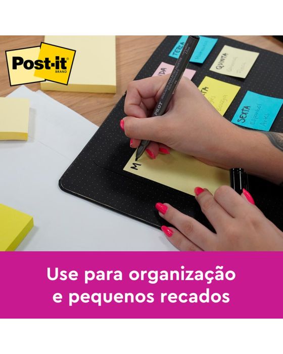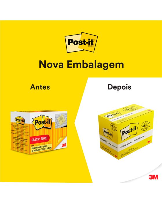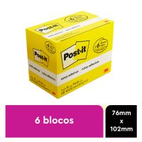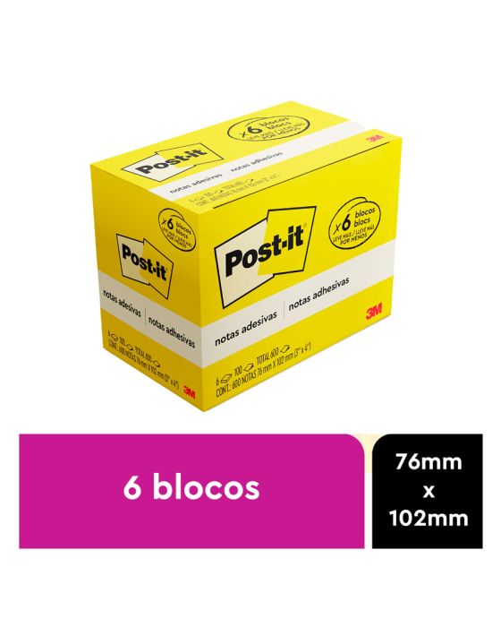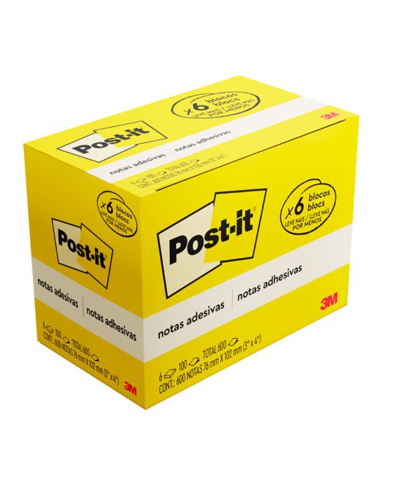 Características:Bloco de notas adesivas para anotar compromissos e recados.Detalhes:- Marca: Post-it®;- Fabricante: 3M;- Modelo: Bloco de Notas Adesivas Post-it®®- Referência: HB004088223;- Linha: Blocos de notas;- Cor: Amarelo;- Embalagem: Leve 6 e pague 5 unidades- Quantidade de folhas por bloco: 100 folhas;- Quantidade de blocos: 6 blocos;- Contém: 1 embalagem com 1 bloco de 100 folhas;- Medidas: 76 x 102mm (7,6 x 10,2cm);- Reciclável;- Suas folhas são reposicionáveis, pois possuem adesivo de qualidade 3M que permite que essas sejam retiradas e recolocadas sem danificar papéis ou outras superfícies;- Todo papel utilizado nas notas Post-it® é certificado pelo SFI (Chain of Custody Certified), o que garante que vem de florestas bem administradas, onde as árvores são replantadas;- Não deixa resíduos do adesivo.Aplicações sugeridas:- Cores diferentes que facilitam na organização, além de terem o tamanho ideal para anotações rápidas;- São ótimos para deixar um recado, anotar um lembrete pessoal, número de telefone ou listar tarefas.Composição:- Adesivo: Papel e adesivo acrílico.AVISO!- O adesivo pode deixar marcas em algumas superfícies ou remover tinta. Teste antes de usar!* As especificações podem ser alteradas sem aviso prévio ** Imagem meramente ilustrativa.