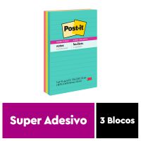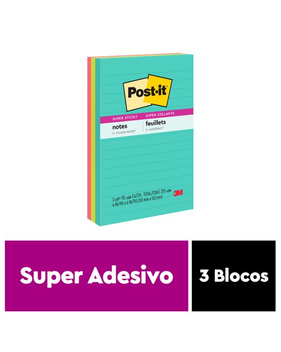 Caracteristicas:As Notas Super Adesivas Post-it® apresentam 2x maior poder de adesão. Com essas notas, você pode colar, descolar e colar novamente para mover lembretes e tarefas ao longo do dia.Você pode usar as Notas Super Adesivas Post-it®, com tamanho de 101 mm x 152 mm, para fazer anotações ou lembretes em portas, monitores, paredes ou janelas. As notas pautadas são ótimas para listas de tarefas ou mensagens mais longas. Seu adesivo exclusivo cola, descola e cola novamente de forma confiável para que sua mensagem fique no lugar que você quiser. Mova suas notas com você ao longo do dia!Detalhes:- Marca: Post-it®;- Fabricante: 3M;- Modelo: Coleção Supernova;- Referência: HB004769483;- Linha: Notas adesivas;- Cores: Telha, Amarelo e Azul elétrico.- Formato: 101 x 152mm.- Quantidade folhas: 90 folhas (270 folhas);- Contém 3 blocos de notas coloridas com 270 folhas;- Cores: Verde, Amarelo e Rosa;- 2 vezes mais poder de adesão do adesivo;- Cola, descola e cola novamente para facilitar sua rotina;- Use para criar lembretes em portas, monitores, paredes e janelas;- São feitas com 30% de papel reciclado;- O papel é proveniente de florestas certificadas, renováveis e geridas de forma responsável.Composição: - Bloco de papel com adesivo acrilico base água.Advertências:- O adesivo pode deixar marcas em algumas superfícies ou remover tinta. As cores podem borrar quando molhadas.- Pode não ser adequado para uso em papel ou superfícies delicadas. Teste antes de usar!As notas de Post-it® são recicláveis.Conteúdo da embalagem: 1 Post-it Colecao Supernova Pautado C/3 101 X 152 3m.* As especificações podem ser alteradas sem aviso prévio ** Imagem meramente ilustrativa.