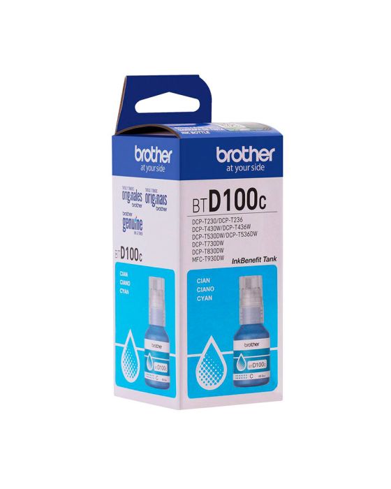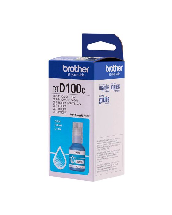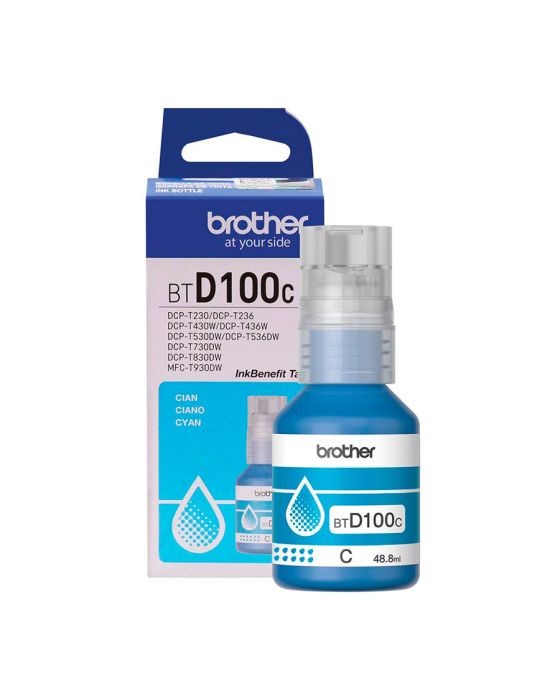 Características:A garrafa de tinta ciano de ultra rendimento da Brother para a linha InkBenefit Tank, oferece cores ricas e vibrantes para impressão de alta qualidade. As novas garrafas de tinta anti-derramamento reabastecem rapidamente o tanque em apenas alguns segundos.Detalhes:- Marca: Brother;- Referência: BTD100C;- Linha: Cartuchos;- Tipo: Tinta;- Cor: Ciano;- Volume cartucho: 48,8ml;- Contém: 1 unidade do produto;- Tecnologia de impressão: Jato de Tinta;- Rendimento: Aproximadamente 5.000 páginas;- Produto Original.Fabricado no Japão. | Validade: Indeterminada sob uso regular.Impressoras Compatíveis:- Modelos impressoras multifuncionais da linha InkBenefit Tank: DCP-T230/DCP-T236, DCP-T430W/DCP-T436W, DCP-T530DW/DCP-T536DW, DCP-T730DW, DCP-T830DW e MFCT930DW.Recomendações:- Para obter uma melhor qualidade de impressão e manter vida útil do seu equipamento, recomendamos o uso dos suprimentos originais Brother;- Esta garrafa de tinta foi projetada de forma inteligente para trabalhar em perfeita harmonia com a impressora Brother InkBenefit Tank, proporcionando resultados de alta qualidade e desempenho confiável;- Os suprimentos originais da Brother produzem impressões nítidas que podem resistir ao teste de tempo.Medidas:- Dimensões embalagem: 4,7 x 4,9 x 10,2cm (CxLxA).Descarte de Cartuchos e Toners:- Você pode fazer o descarte com ajuda do ReCiclo, um projeto da Contabilista através da Contabilista Responsável, basta enviar os seus resíduos para a nossa Central de Distribuição*, se você é de Curitiba ou de Joinville, pode ir até uma de nossas lojas ou preencher o formulário disponível no site para solicitar retirada de materiais.Acesse o Link para verificar as marcas que reciclamos e nossos endereços: https://www.contabilistaresponsavel.com.br/reciclo.* Enviar conteúdo aos cuidados do Setor de Reciclagem.** Atenção: Cartuchos e Toners compatíveis não entram no descarte do ReCiclo, apenas suprimentos originais de nossos parceiros (confira a lista no link acima).*** Caso a Contabilista receba cartuchos e toners de outras marcas, não poderemos nos responsabilizar pela reciclagem e devolveremos ao remetente.**** Peso máximo para coleta: 10 kg.Conteúdo da embalagem: 1 Cartucho de Tinta Ciano Brother.Garantia do fornecedor: 90 dias de garantia limitada.* As especificações podem ser alteradas sem aviso prévio ** Imagem meramente ilustrativas