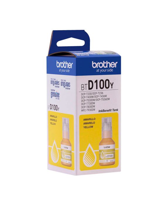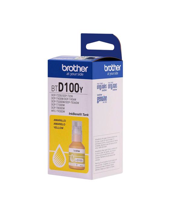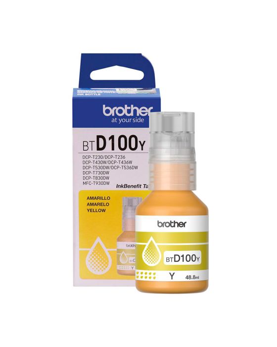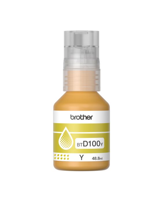 Características:A garrafa de tinta amarelo de ultra rendimento da Brother para a linha InkBenefit Tank, oferece cores ricas e vibrantes para impressão de alta qualidade. As novas garrafas de tinta anti-derramamento reabastecem rapidamente o tanque em apenas alguns segundos.Detalhes:- Marca: Brother;- Referência: BTD100Y;- Linha: Cartuchos;- Tipo: Tinta;- Cor: Amarelo;- Volume cartucho: 48,8ml;- Contém: 1 unidade do produto;- Tecnologia de impressão: Jato de Tinta;- Rendimento: Aproximadamente 5.000 páginas;- Produto Original.Fabricado no Japão. | Validade: Indeterminada sob uso regular.Impressoras Compatíveis:- Modelos impressoras multifuncionais da linha InkBenefit Tank: DCP-T230/DCP-T236, DCP-T430W/DCP-T436W, DCP-T530DW/DCP-T536DW, DCP-T730DW, DCP-T830DW e MFCT930DW.Recomendações:- Para obter uma melhor qualidade de impressão e manter vida útil do seu equipamento, recomendamos o uso dos suprimentos originais Brother;- Esta garrafa de tinta foi projetada de forma inteligente para trabalhar em perfeita harmonia com a impressora Brother InkBenefit Tank, proporcionando resultados de alta qualidade e desempenho confiável;- Os suprimentos originais da Brother produzem impressões nítidas que podem resistir ao teste de tempo.Medidas:- Dimensões embalagem: 4,7 x 4,9 x 10,2cm (CxLxA).Descarte de Cartuchos e Toners:- Você pode fazer o descarte com ajuda do ReCiclo, um projeto da Contabilista através da Contabilista Responsável, basta enviar os seus resíduos para a nossa Central de Distribuição*, se você é de Curitiba ou de Joinville, pode ir até uma de nossas lojas ou preencher o formulário disponível no site para solicitar retirada de materiais.Acesse o Link para verificar as marcas que reciclamos e nossos endereços: https://www.contabilistaresponsavel.com.br/reciclo.* Enviar conteúdo aos cuidados do Setor de Reciclagem.** Atenção: Cartuchos e Toners compatíveis não entram no descarte do ReCiclo, apenas suprimentos originais de nossos parceiros (confira a lista no link acima).*** Caso a Contabilista receba cartuchos e toners de outras marcas, não poderemos nos responsabilizar pela reciclagem e devolveremos ao remetente.**** Peso máximo para coleta: 10 kg.Conteúdo da embalagem: 1 Cartucho de Tinta Amarelo Brother.Garantia do fornecedor: 90 dias de garantia limitada.* As especificações podem ser alteradas sem aviso prévio ** Imagem meramente ilustrativas.