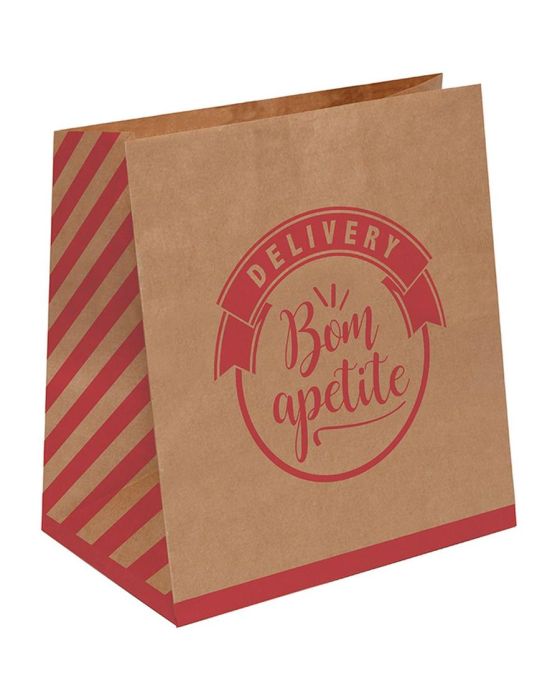 Caracteristicas: - Saco de Papel Kraft 70 gramas decorado com escrita bom apetite em vermelho - Indicado para uso em Delivery de alimentos - Vendido embalagem com 50 unidades - Cor: Kraft - Tamanho: M - Medidas: Altura x Base x Lado em cm: 28,5x24x12cm - Marca: Cromus * As especificações podem ser alteradas sem aviso prévio ** Imagem meramente ilustrativa.