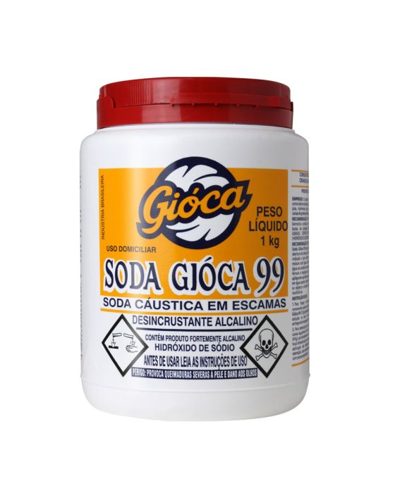 Caracteristicas:O desincrustante alcalino Soda Gióca 99 possui alta performance na remoção de sujeiras e gorduras, em limpeza de pias, mármores, pisos, vasos sanitários, tanques, ralos e caixas de gordura em diluição.Detalhes:- Marca: Gióca.- Modelo. 99.- Linha: Soda Cáustica.- Peso: 1kg.- Contém: 1 pote com 1kg do produto.- Possui tampa de segurança, a prova de abertura de crianças.- Não aplique em superfícies aquecidas.Composição:- NaOH (Hidróxido de Sódio – Soda Cáustica).Instruções de uso:1- Para limpar e desincrustar pisos frios em geral, removendo sujeiras e gorduras: - Dissolva 1 colher de Soda Gióca 99 (15g) aproximadamente em 1L de água. - Aplique a solução no piso e deixe agir por alguns minutos, esfregando em seguida com escova. - Enxágue bem.2- Para desentupir pias, ralos, tanques, vasos sanitários e caixas de gordura: - Dissolva 3 colheres de Soda Gióca 99 (45g) aproximadamente em 1L de água e aplique sobre o local deixando agir por alguns minutos. - Se após a primeira aplicação não desaparecer o entupimento, repita a operação, caso o entupimento continue, entre em contato com pessoa especializada.Recomendações:- Para abrir, pressione a tampa no local indicado e gire conforme a indicação da mesma. - Não misture com água na embalagem original. A adição de água ao produto concentrado, libera calor e pode causar fervura e respingos do produto quente e cáustico.- Nunca dissolver o produto em água quente.- Nunca reutilize a embalagem vazia.- Lave os objetos e utensílios utilizados como medida antes de reutilizá-los.Armazenamento:- Conservar em local seco e fresco. Permanecendo em lugar seco e fresco e a embalagem inviolada o produto mantem-se estável. - Proteger o produto da umidade.- NÃO REUTILIZAR A EMBALAGEM VAZIA.ATENÇÃO! CONSERVE FORA DO ALCANCE DE CRIANÇAS E DOS ANIMAIS DOMÉSTICOS.* As especificações podem ser alteradas sem aviso prévio ** Imagem meramente ilustrativa