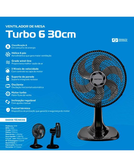 Ventilador De Mesa Turbo Premium 6p 52w 30cm 127v Ventisol