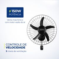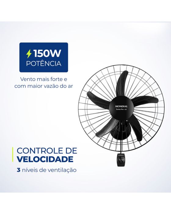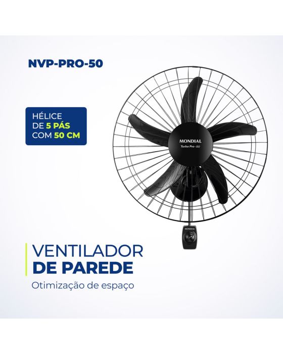 Características:O Ventilador de Parede Turbo Pro NVP-PRO-50 possui 50 cm de diâmetro e um design aerodinâmico de alta performance, que garante um ambiente sempre fresquinho, mesmo nos dias de calor intenso. O motor Turbo Pro de 150W, aliado a hélice de 5 pás, gera mais intensidade do vento e maior vazão do ar.Detalhes:- Marca: Mondial;- Modelo: Turbo;- Referência: NVP-PRO-50;- Linha: Ventiladores;- Cor: Preto;- Tensão: 220V;- Tipo de instalação: Parede;- Uso: Somente uso interno;- Contém: 1 unidade do produto;- Número de velocidades: 3 velocidades (mínimo, média e máxima);- Quantidade de pás: 5 pás;- Hélice com diâmetro de 50cm;- Grade frontal removível;- Inclinação vertical regulável;- Controle de velocidade para fixar na parede;- Mais silêncio e conforto;- Ambiente ventilado e espaço otimizado.Diferenciais:- Ventilador de 50cm + Hélice com 5 Pás: O design aerodinâmico e de alta performance do NVP-PRO-50 proporciona maior intensidade do vento e melhor distribuição de ar. O resultado é um ambiente mais fresco e arejado!- Otimização do Espaço + Suporte de Aço Reforçado: O ventilador de parede permite maior otimização do espaço. Além disso, o suporte que prende o aparelho à parede é de aço reforçado, garantindo maior sustentação e durabilidade;- Potência: 150W: Garante vento mais forte e com maior vazão do ar;- Grades de Aço Desmontável: A grade frontal de aço desmontável oferece mais segurança, resistência e facilidade na limpeza das hélices, o que simplifica a lavagem e a remoção de poeira, e garante melhor qualidade do ar; - Cntrole de Velocidade: As 3 opções de velocidade permitem adequar o vento à sua necessidade: Máxima Turbo, Média Conforto e Mínima Brisa;- Maior Distribuição de Ar: O Sistema Oscilante Contínuo amplia o raio de alcance do vento no ambiente, permitindo uma distribuição de ar mais eficiente nos cômodos da casa.- Inclinação Vertical Regulável: Para um direcionamento ideal do fluxo do ar.Energia:- Tensão: 220V;- Potência: 150W.Medidas:- Dimensões do produto montado: 50 x 50 x 50cm (CxLxA);- Dimensões da embalagem: 51,3 x 22,3 x 52,3cm (CxLxA);- Peso: 2,2kg.Conteúdo da embalagem: 1 ventilador de Parede Turbo NVP-PRO-50 Britânia e 1 manual de instruções.Garantia do fornecedor: 1 ano contra defeitos de fabricação.* As especificações podem ser alteradas sem aviso prévio ** Imagem meramente ilustrativa.